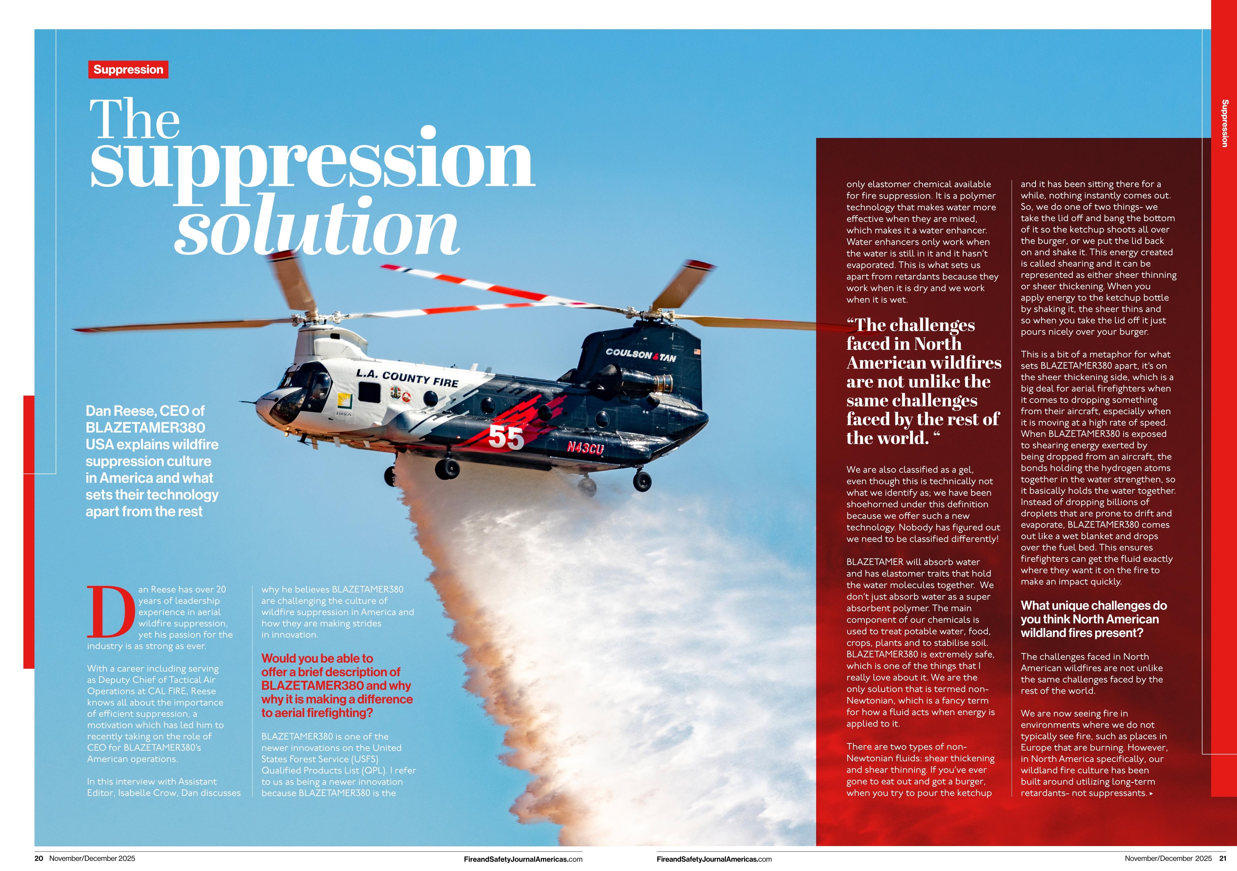 In an interview with Fire & Safety Journal Americas editor Isabelle Crow, BLAZETAMER380 CEO Dan Reese shares valuable insights into the evolving culture of wildfire suppression. The feature explores how innovative fire suppressant solutions like BLAZETAMER380 are helping firefighters respond more effectively, safely and sustainably to the challenges of modern wildfire management.